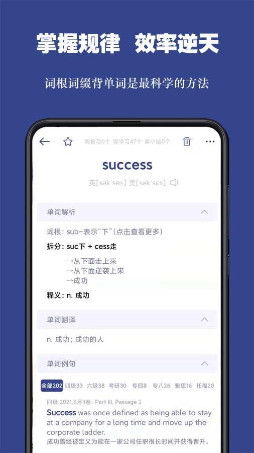 词根单词官方版是一款快速掌握英语单词的软件,采用了词根加词缀的记忆方法,让学生更好的去了解英语,从而达到高效的记忆办法,里面有着大量词汇够你应对各种考试.