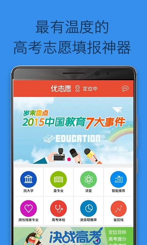 优志愿是一个很好用的在线填报志愿软件,你可以在这里查询自己喜欢学校的信息和录取分数线,软件还会根据每个学生的意向推荐专业不会让你有遗憾和落差快来试试吧。
