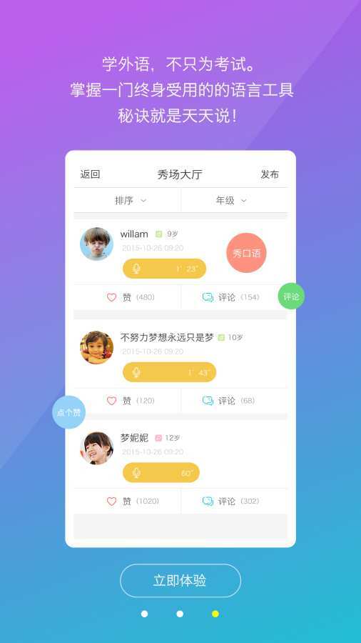 天天口语是一款给孩子在不同阶段练习口语的软件,很好的巩固外语知识,有了这个软件后不需要在带着孩子走补习班劳累奔波了,快来试试吧。