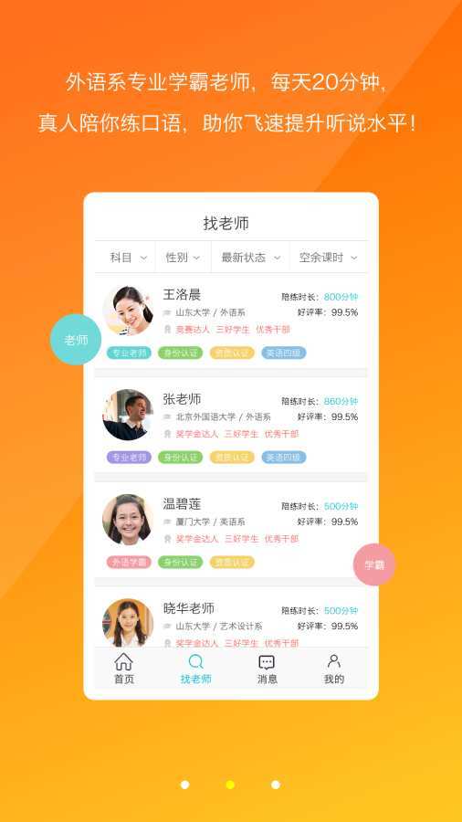 天天口语,是一款专注为6-18岁中小学生练习口语、提升分数而量身打造的真人1对1教辅平台。平台萃聚全国重点高校外语学霸,让每位中小学生都可以找到一位适合自己的英语老师,每天1对1练习口语对话、辅导英语学习助力应试与素质教育双提高。