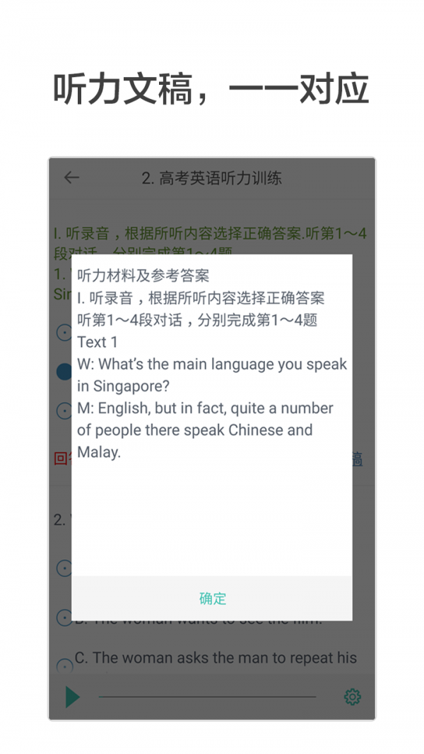 1、每套听力试题都有高清的配音,听力文稿和答案也一一对应,随时查看