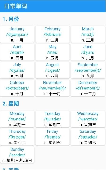 2、每一个音标都要对应的多个单词示例,日常单词,包括"月份", "星期", "四季", "数字", "日常用语", 等生活中常见的单词。