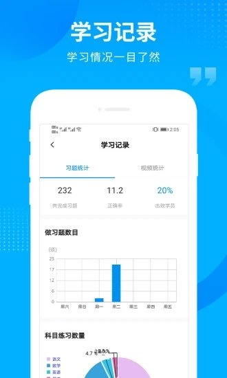 4.通过图表和数据提供学习记录,显示练习统计和视频统计。