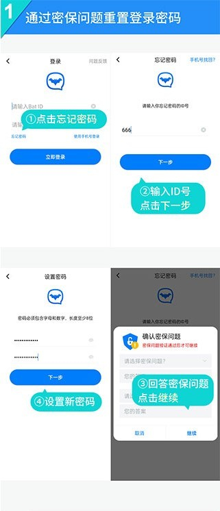 当处于未登录状态时,可在登录界面点击密码输入框下方的【忘记密码】选项,随后输入自己的Bat ID并按照指引回答之前设置的密保问题来重设密码。另外,在忘记密码页面右上角还提供了【手机号找回】功能,通过手机验证码也可完成密码重置。
