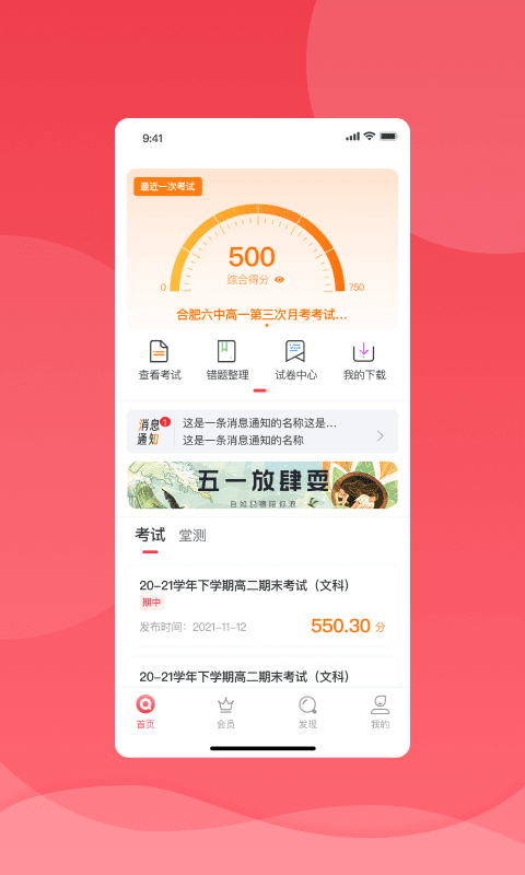 2、登录过后,在首页就能看到您孩子近期的考试列表,总分和各科成绩一目了然