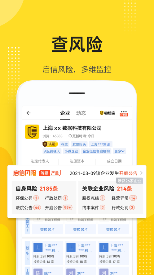启信宝一款智能的随时可以查看企业的手机软件,这里随时可以一键查看自己所有想看的资源,在这里随时可以帮助商务对接,快速查询,这里提供的都是针对性的服务,有兴趣的快来下载体验吧。