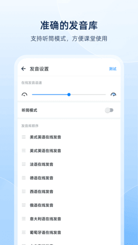 正宗发音:可自由选择美式和英式发音,可定制发音速度和小语种发音。