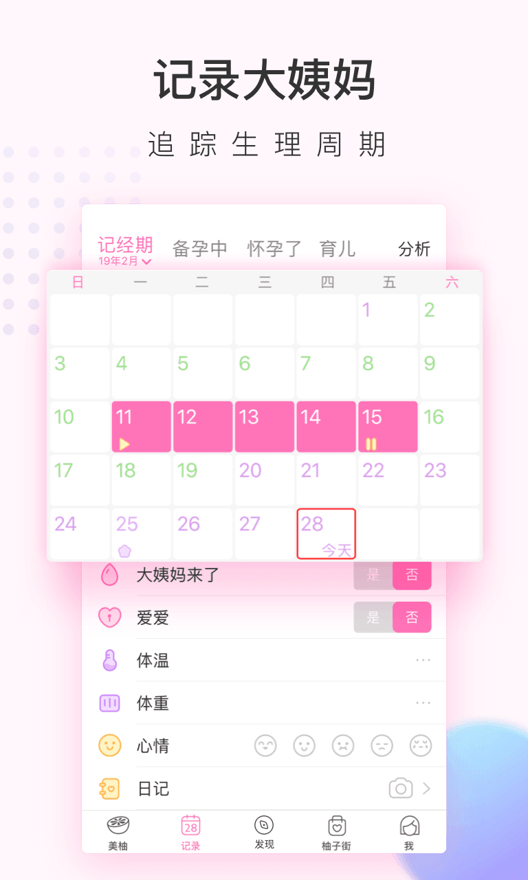 只要简单记录大姨妈月经期日期,自动推算大姨妈月经期、排卵期以及减肥美容丰胸时间