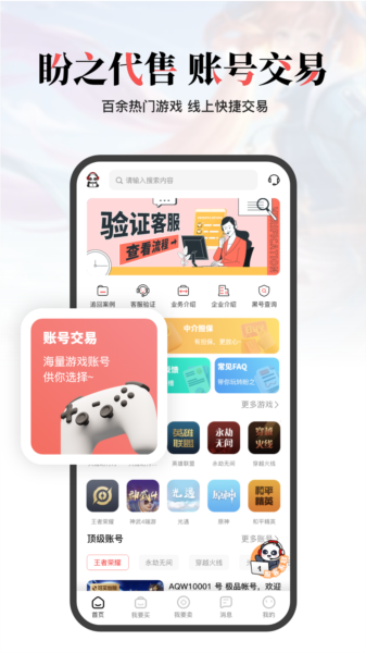 盼之代售手机版一个可靠的游戏交易平台,玩家可以通过软件查看心仪游戏的账号,还可以对自己的账号进行估价,你可以看到许多热门的手游和端游账号,软件还有客户为你解决难题,交易安全打款也很快,有需求的小伙伴快来下载吧。