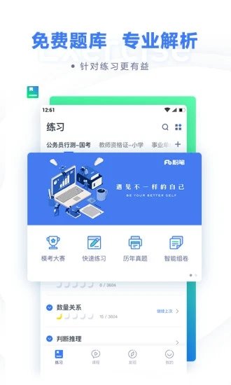 3、个性出题:根据目标考试的考点,考频,难度,智能出题;记录用户练习情况,生成数据报告,预测考分。