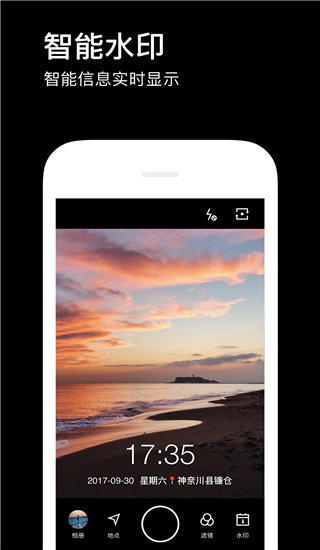 2.智能的水印模版:天气、地点、时间、分贝、海拔、速度,智能水印自动添加到照片上;