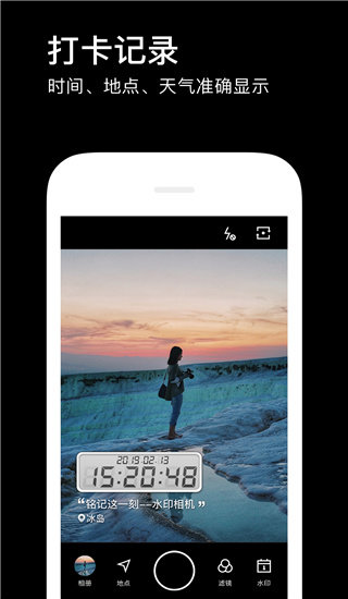 2.智能的水印模版:天气、地点、时间、分贝、海拔、速度,智能水印自动添加到照片上;