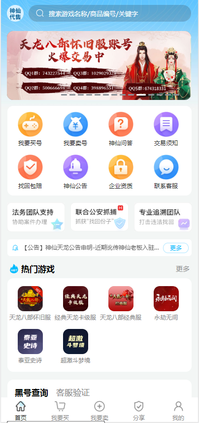 神仙代售app是一款可以在这里实现例如王者,原神,天龙八部等游戏账号交易的平台,还能对游戏内部的资源进行交易。官方背书,买卖双方都能做到安心放心,想要出售或者购买的小伙伴,点击下载平台,挑选你满意的商品吧。