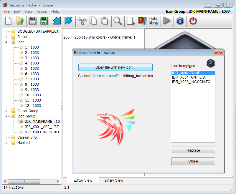 图像资源(图标、指针和位图)可以被相应的图像文件(*.ico,*.cur,*.bmp)、*.res文件、甚至是另一个*.exe文件所替换。