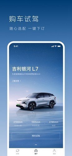 【购车】为用户提供吉利银河汽车的全方面核心产品亮点,帮助用户熟知购车活动,提供购买指导,支持在线选配,试驾预约,完成一键下订。