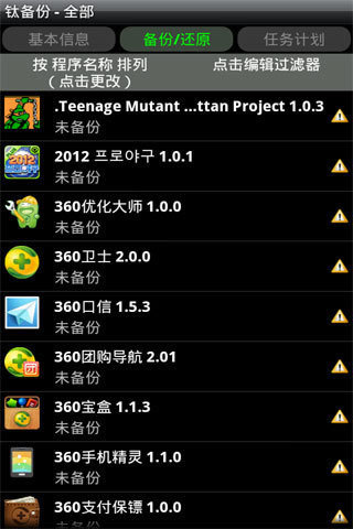 钛备份是专门为Android操作系统备份所开发的软件,可以根据设置和需求,对整个系统或者部分软件进行备份和还原,以免误操作造成的系统损坏和软件损坏,它不仅能够备份手机上的所有程序,还能保存每个程序的数据、Android市场链接等等。十分强大,大大减少了恢复系统时所需的时间,可谓是安卓系统的Ghost,是目前最为强悍的程序和系统备份工具, 需ROOT权限运行。
