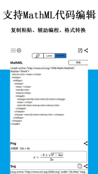 3、支持个性化导出设置,导出格式:Latex、Png、Svg、MathML