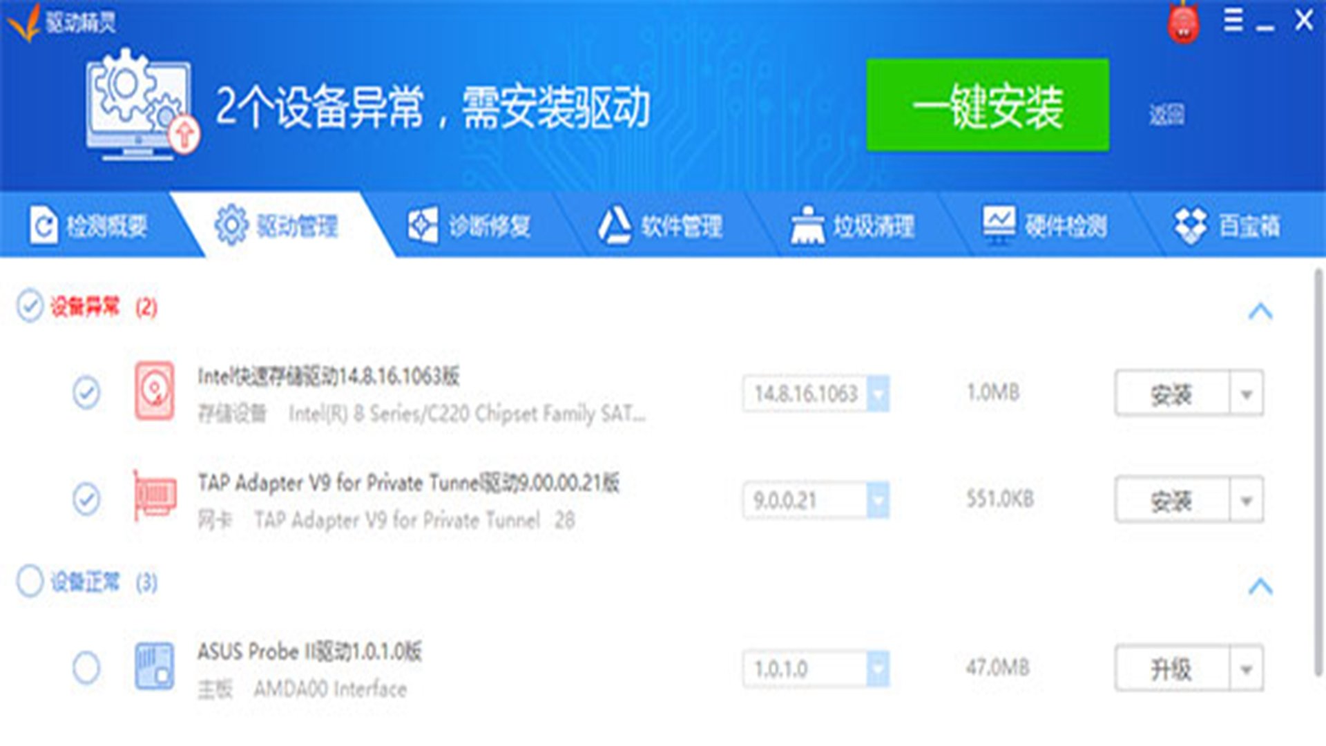 6、在检测概要中,可以看到需要升级的驱动,优化的项目,清理的垃圾等选项,直接点击即可升级或修复。