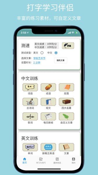 3.自定义文章让你可以加入任意文字进行练习,建立自己的练习素材库。