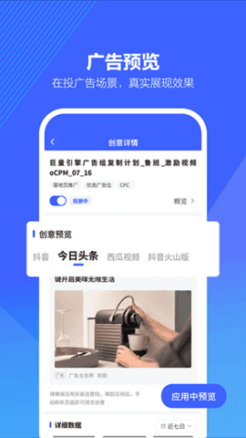 1、广告创建:低门槛、易上手、创编流程简单、智能生成投放素材,四步即可完成广告投放;