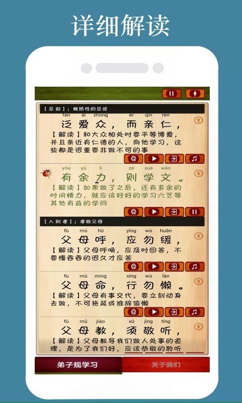 弟子规拼音版是一款非常实用的手机教育学习平台,这里对中国传统文化弟子规有着详细的讲解,让孩子在早教的过程中更好的去掌握着学习内容,真人发音经典诵读,还有全文解释分析,拼音标识等。有需要的可以在本站免费下载。