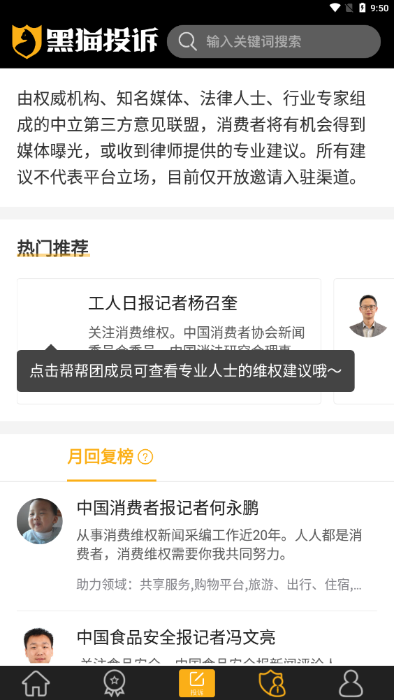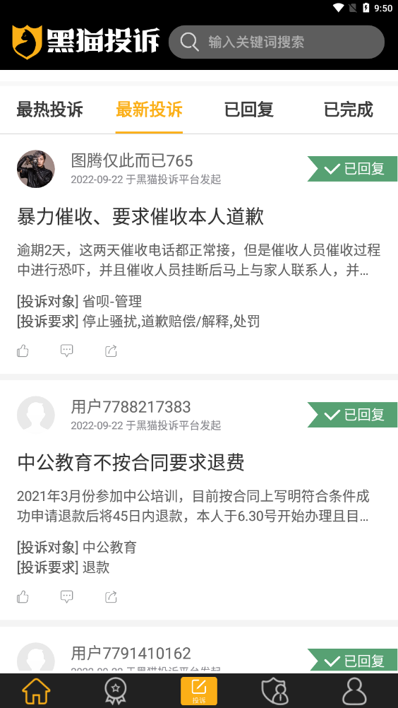 4.黑猫投诉平台支持广大消费者在受骗等情况下在线投诉,帮助解决的平台,平台由新浪推出,提供一个公正的买家与商家的沟通平台。