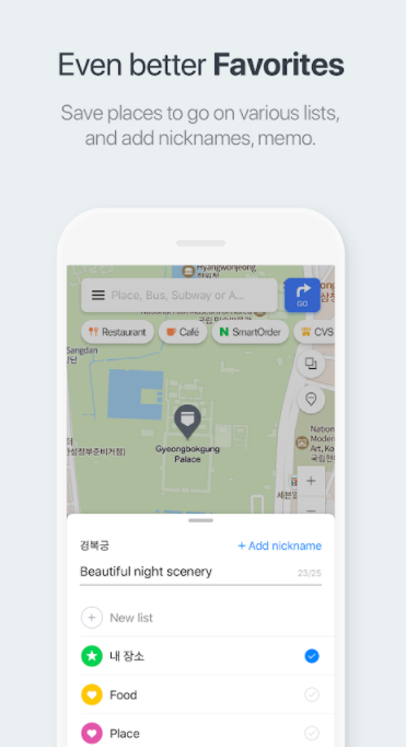 韩国地图是一款非常实用的导航软件,在这里有全新的导航方式,如果你身处韩国,那么这款软件是必不可少的,想去哪里直接一键搜索即可,还会为你智能规划出行方式,精准定位你想去的地方,让你快速到达目的地。赶快下载体验吧。