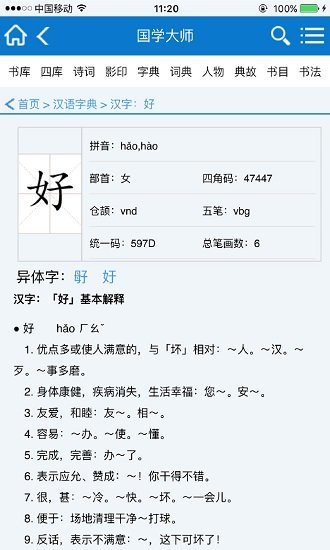 1、国学大师最新版拥有46万个书法作品,还有海量的释义、词语