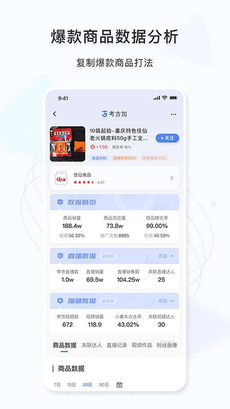 考古加app是一款为抖音直播打造的数据分析软件,可以对抖音直播的商品数据进行实时分析,帮助你找到最有价值的商品,深度结合直播需求,挖掘内容数据电商价值,为你带来全网最火热的带货主播,有需要的赶快下载试试吧。