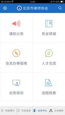 3、主要提供与会员相关的信息和服务,包括:会员信息、通知公告、专业领域、会员办理指南、人才交流、业务培训、法律检索、