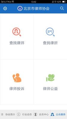 4、主要提供北京市律师协会律师及律师事务所会员查询,提供律师投诉通知及律师公益信息。