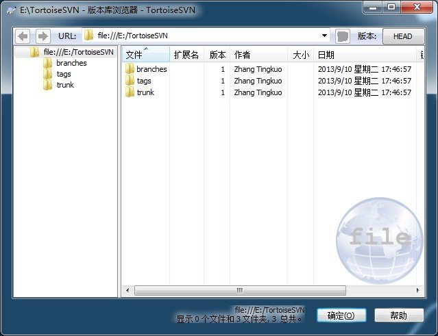 通过点击“创建目录结构”,TortoiseSVN自动创建了3个文件夹,branches,tags,trunk,