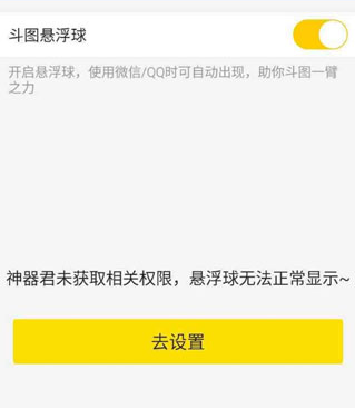 1、打开 APP 后,第一步可设置斗图悬浮球。悬浮球开启后,在使用微信或 QQ 时会自动出现,助力你畅快斗图。要是你的手机当前未授予此权限,可先前往设置进行操作。