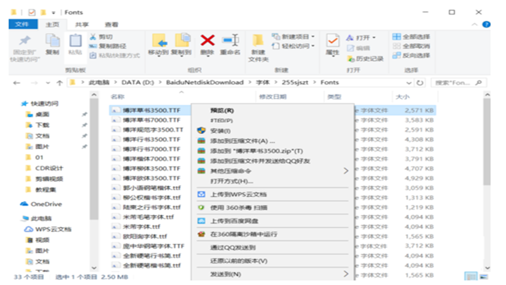 1、将字体下载到本地,选择本地字体文件,单击右键选择复制