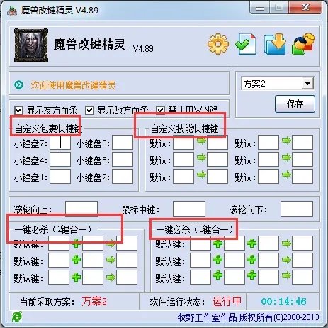 包裹键改键和一般技能快捷键改键大家都应该懂的,就是多键合一可能大家不是太懂,我讲下,二键合一的第一个键和三键合一的前面两个键必须为非指向技能,就是说A+B=C或者A+B+C=D,第一个中的A和第二个中的A与B不能为指向技能,最后一个键可以是指向,也可以是非指向。下面我说下指向和非指向的区别,指向就是说你按下技能快捷键后还有鼠标操作,比如说DOTA的跳刀,山丘的G,按下技能键后还要点到英雄身上或者点到某一个地方,这个为指向,非指向就是你按下技能键后就直接放出来的,比如DOTA的黑皇,真三的玄武或者张飞的VT都是非指向的。