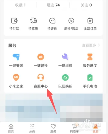 进入小米商城APP我的页面,在服务下,点击【客服中心】。(如图所示)