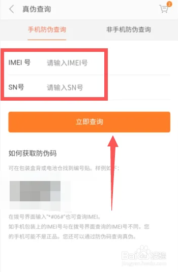 切换页面后,输入IMEI号及SN号,点击【立即查询】,即可查看真伪结果。(如图所示)