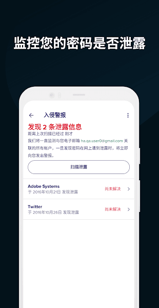 ■ 黑客警报:通过快速简单的扫描,查看您的哪些密码已经泄露,这样就可以在黑客入侵您的帐户之前更新您的登录凭据。
