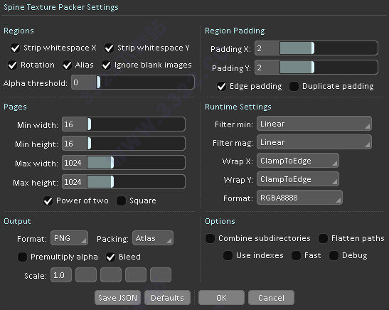 Spine的纹理贴图打包工具拥有很多功能比如剥离空白区域,旋转,自动缩放等等…(主要目的是为了充分利用空间)
