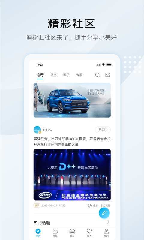 社区互动与分享:比亚迪王朝App还提供了一个社区功能,用户可以在这里与其他车主交流、分享经验,共同探讨汽车使用、保养等方面的问题。这不仅增加了用户的社交互动,还为用户提供了学习和交流的平台。