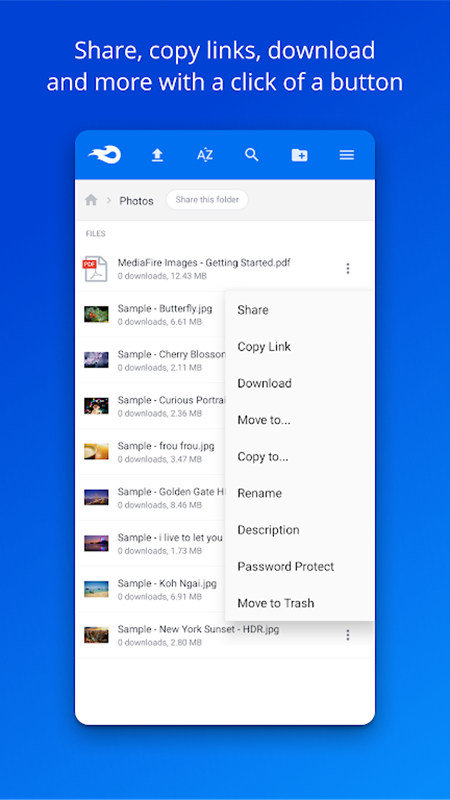 mediafire手机版是一款非常实用的网盘存储软件,可以让用户轻松处理自己的文件和照片,进行更加便捷的管理,优化手机的使用,大大节省了手机的存储空间,满足你的所有需求,软件提供了丰富的文件管理,让你轻松处理文档,资料等,有需要的赶快下载吧。