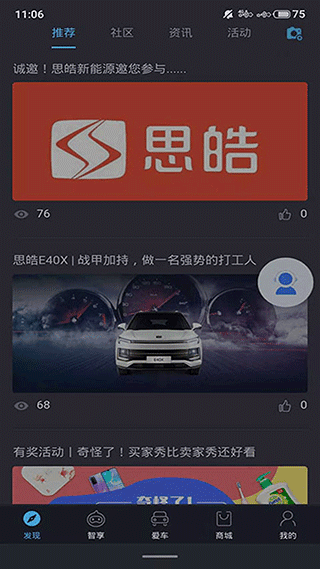 1、包含发现、智享、爱车、商城、我的五大模块,为客户更好的使用车辆提供优质的服务;