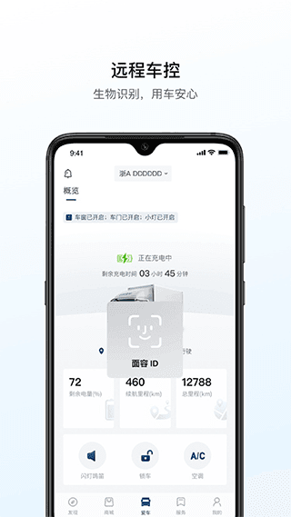 支持使用APP实时查看车况,包括里程数、剩余SOC、小灯,和车门与门锁的开关状态。利用远程汽车APP,车主可随时随地控制并寻找爱车。操控功能包括开关车门、空调与转向灯,鸣笛和调节温度。与此同时,为了保证爱车与车主安全,APP安装了全面的故障预警与异常提示功能;