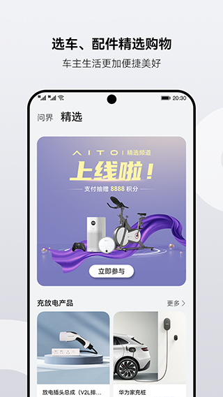 提供多品类商品选择,AITO 购物精选频道,伴随出行更轻松。