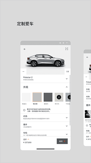 Polestar应用不仅让您全面了解极星汽车性能表现,更通过多角度多场景展示汽车细节(包括外饰,内饰,车轮等配置)。您可以尽情选择多样化的配置组合,同时Polestar应用将随着您的选择更换配置展示,为您提供极致到位的爱车定制化体验。