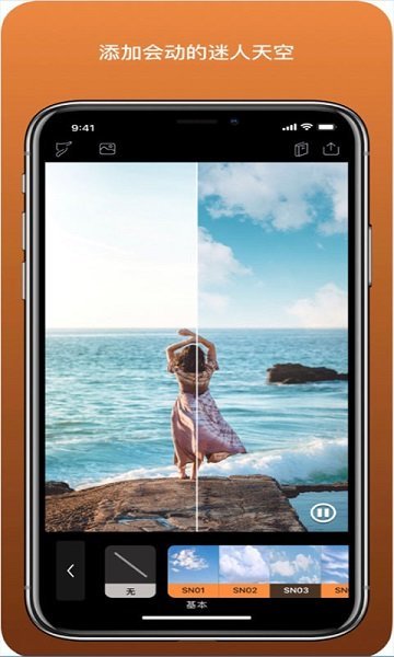 1、动态天气:用户可以利用给风景照片中的天空添加飘动的云彩、闪电等天气效果,让照片更有层次感和动感。