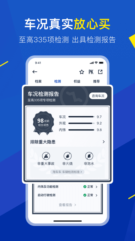 2、提供上百项专业车辆检测报告、杜绝问题车事故车,让您买车无后顾之忧。