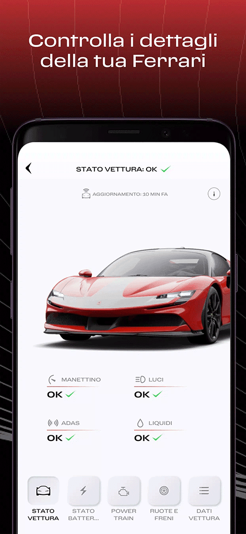 1、访问MyFerrari Connect 服务非常简单:只需进入MYFerrari应用程序上的MyGarage部分,其中包含有关您汽车的所有信息。如果您看不到该信息或想要检查您的车型是否已设置MyFerrari Connect服务,请联系您的经销商。