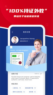 10000多位全球外籍教师团队,来自美国、英国、菲律宾等国家,100%具有国际英语教学资格认证(TEFL/TESOL)及各行业工作背景。
