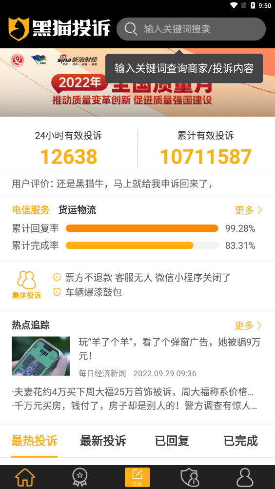 企业信誉透明化:黑猫投诉平台通过展示企业的处理效率和满意度,让消费者更加直观地了解企业的信誉和服务质量。这有助于消费者在选择商家时做出更加明智的决策,避免陷入消费陷阱。